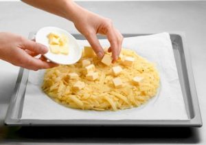 Geschwellti schälen, an der Röstiraffel auf ein mit Backpapier belegtes Blech reiben, würzen, zu einer Rösti formen (ca. 24 cm Ø). Butter in Stücken darauf verteilen.