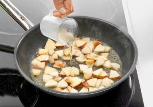 Apfel in Scheibchen, Zwiebeln in Ringe schneiden. Kalbsleber und Zwiebel im heissen Öl portionenweise je ca. 1 Min. braten, herausnehmen. Hitze reduzieren, Apfelscheibchen andämpfen.