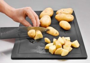 Kartoffeln mit der Schale in Stücke schneiden, offen im Salzwasser ca. 20 Min. weich kochen. Tomaten halbieren, Schalotten in Streifen und Schnittlauch fein schneiden, beiseite stellen.