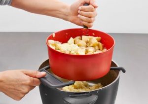 Wasser abgiessen. Restfeuchtigkeit der Kartoffeln unter hin und her bewegen der Pfanne auf der ausgeschalteten Platte verdampfen lassen, bis sie trocken sind. Kartoffeln durchs Passevite in die Pfanne treiben. Öl darüberträufeln.