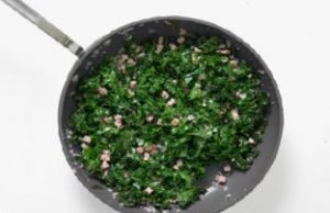 Federkohl, Zwiebel und Knoblauch hacken, mit den Schinkenwürfeli im warmen Öl ca. 2 Min. andämpfen, auskühlen.