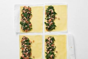Saft der Tomaten in eine gefettete ofenfeste Form von ca. 2 Litern giessen. Tomaten mit der Kohlmasse und der Hälfte des Käses mischen, würzen. Pastateige in je vier gleich grosse Stücke schneiden. Füllung auf die Pastastücke verteilen.
