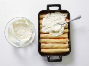 Von der Seite her aufrollen, die Cannelloni auf den Tomatensaft legen. Restlichen Käse mit Crème fraîche mischen, darauf verteilen.